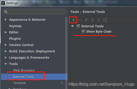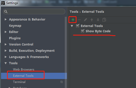 1、打开IDEA,点击File->Settings。选择Tools->External Tool。点击左上角绿色的加号,如下:
