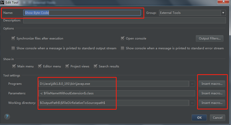 因此可以基于该命令在IDEA中设置宏,来快捷使用javap查看字节码,设置过程如下: