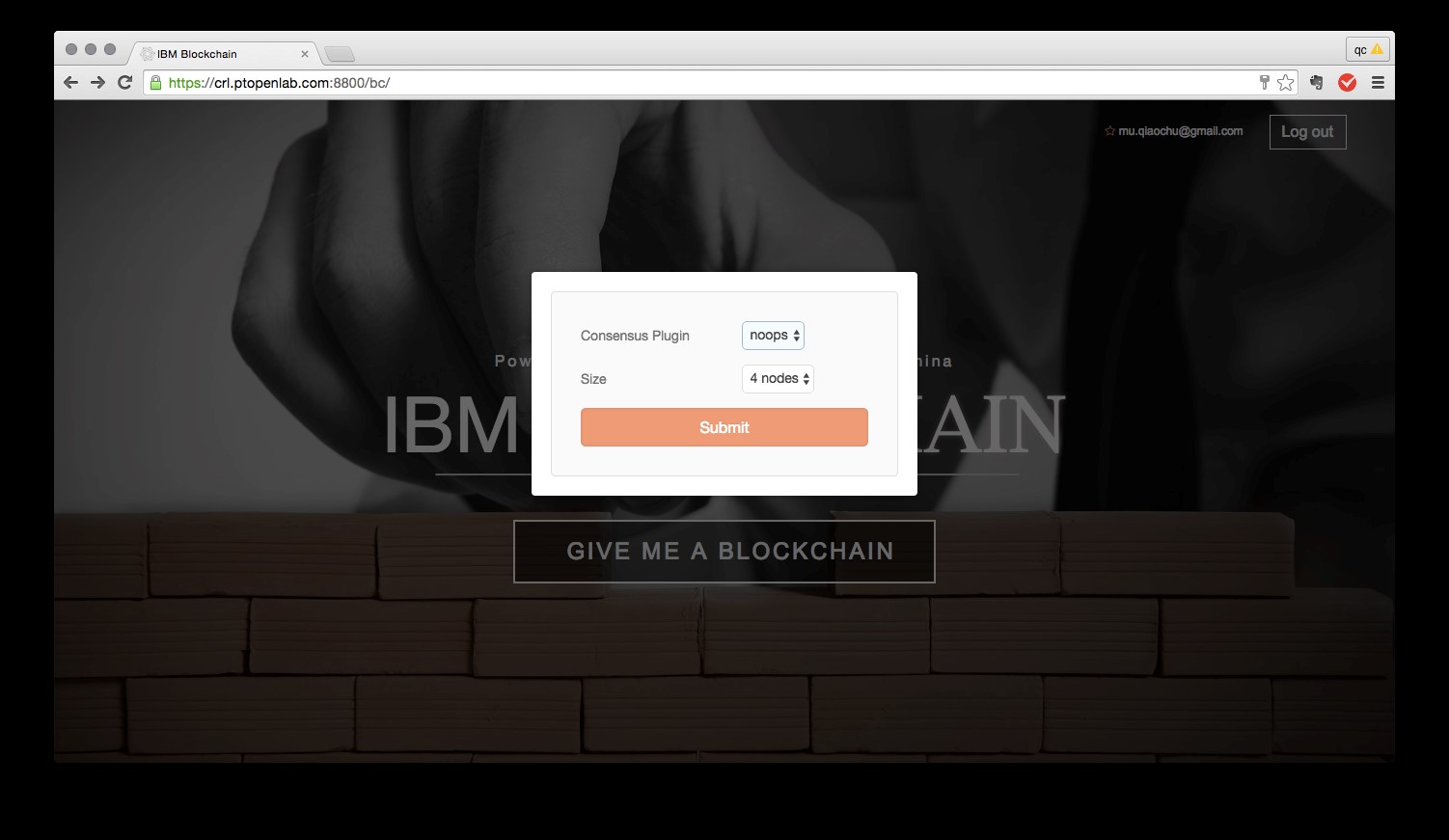 注册完成后,回到主页,点击偌大的GIVE ME A BLOCKCHAIN(给我一个区块链!)按钮。在弹出框中选择你想要的Consensus Plugin(共识插件)和Size(区块链网络节点数量)。