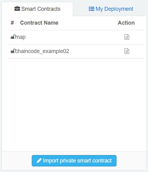 在智能合约管理面板的Smart Contracts(智能合约)标签下列出了2个智能合约作为示例,分别为map和chaincode_example02。其中map合约可以实现键值对(key-value)的存储,chaincode_example02合约可以模拟两个人的转账和查询。