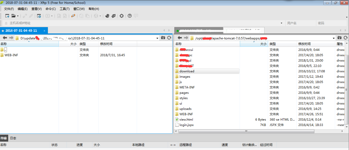(2)使用xftp上传覆盖代码,由于打包出来是可以直接上传实现替换,故此步骤非常简单(此步骤已经编写自动化脚本实现代码发布,执行上传到脚本所在服务器的专用代码发布目录,执行脚本发布即可)