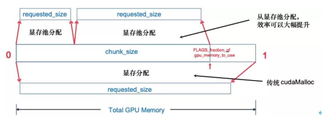 之后每次申请显存都会从chunk中分配。若requested_size大于chunk_size,则框架会调用cudaMalloc分配requested_size大小的显存。chunk_size一般依据初始可用显存大小按比例确定。