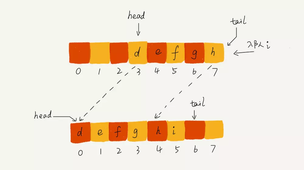 具体实现中,假设数组有10个长度,当tail=9时,进行入队操作,这个时候tail不进行+1,而是=0。