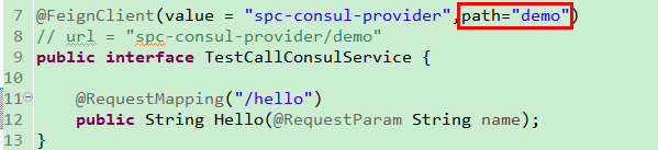 如上图,@ FeignClient(value = "spc-consul-provider",path="demo")应该再加一个配置path,这个path是被调用工程的工程调用名,在被调用工程(微服务生产者)配置的这个server.servlet.context-path=/demo。