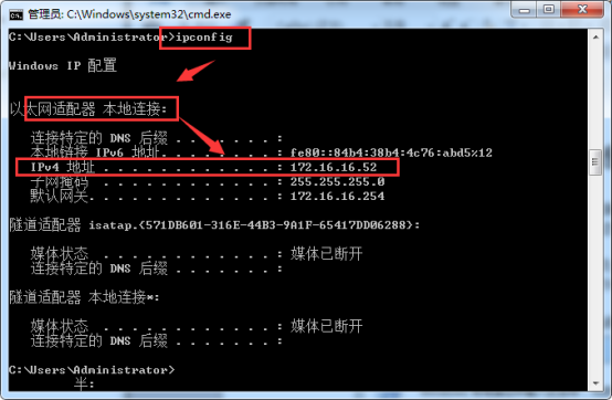 1.要远程控制其他计算机就应该知道被控制的计算机的ip,查询ip的方法很简单,cmd中输入ipconfig命令:
