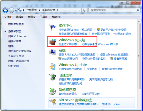 2在弹出的界面点击“windows防火墙”: