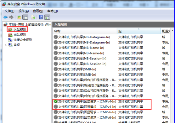 4.点击“入站规则”,并在右侧的 入站规则 中找到“文件和打印机共享(回享请求-ICMPv4-In)”: