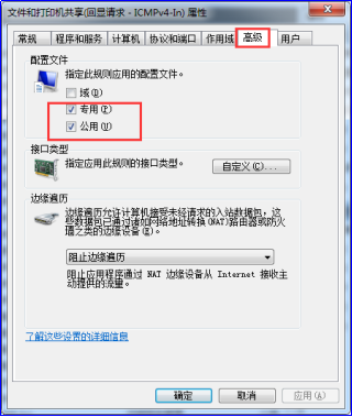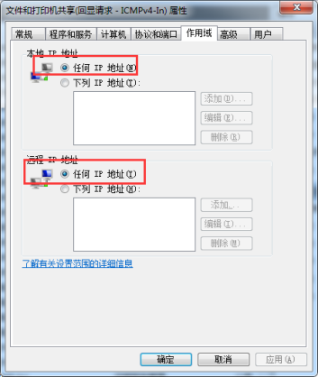 5.双击“文件和打印机共享(回享请求-ICMPv4-In)”进入其 属性 界面,在”作用域“页面的“远程IP地址”选择“任何IP地址”,在“高级”页面的“配置文件”同时勾选“专用”、“公用”,之后点击“确定”保存设置: