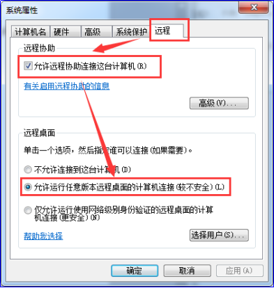 1.右键点击我的电脑进入属性点击左边菜单栏中的远程设置,把远程桌面选项设置成允许运行任意版本远程桌面的计算机连接。