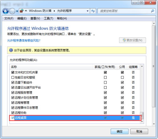 将Remote Desktop相关的都打开.还是不行,打开允许程序或功能通过windows防火墙,勾选远程桌面: