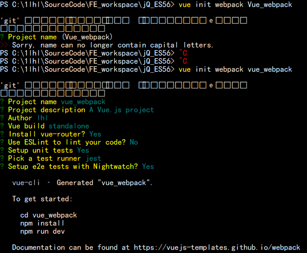 【注意:项目名只能是英文,不能有大写字母!否则会报错,如下sorry,name can no longer contain capital letters】比如:vue_webpack