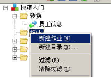 DMETL中的作业的功能是控制转换以及其它任务运行的时间和顺序。作业由节点和连线组成。节点表示一个任务,而连线则表示任务的执行顺序和条件。转换和作业都可以设置调度,由服务器在后台自动执行。展开创建好的工程工程,在【作业】节点上点击右键选择【新建作业】菜单项,弹出新建转换对话框,输入作业名和作业描述点击确定即可完成作业的创建。