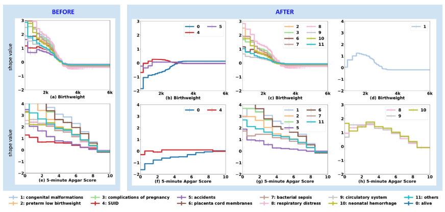 在一个预测婴儿死因的数据上(12类分类问题),我们采用API对shapefunction做了处理,从而使得他们能真实地反应预测概率变化的趋势。这里可以看到,在采用API之前,模型可视化提供的信息是所有死因都和婴儿体重和Apgar值成负相关趋势。但是在采用API之后我们发现,实际上不同的死因与婴儿体重和Apgar值的关系