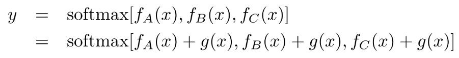 对于一个softmax函数,如果在每一个输入项中加上同一个函数,由此得来的模型是和原模型完全等价的。也就是说,这两个模型在任何情况下的预测结果都相同。基于这样的性质,我们就可以设计一个g 函数,让加入g函数之后的模型满足我们想要的性质。