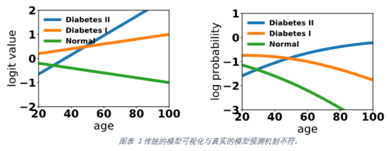 本文首先讨论了在多分类问题的下,传统可解释性算法(例如逻辑回归,SVM)的可视化图像与模型的预测机制之间存在的矛盾。如果直接通过这些未经加工的可视化图像理解模型预测机制,有可能造成建模人员对模型预测机制的错误解读。如图1所示,左边是在一个多分类GAM下age的shape function。粗看之下这张图表示了Diabetes I的风险随年龄增长而增加。然而当我们看实际的预测概率(右图),Diabetes I的风险其实应该是随着年龄的增加而降低的。