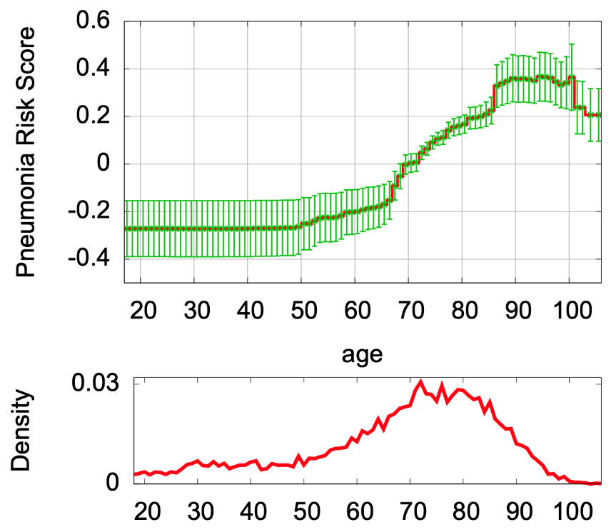 其中g是linkfunction,fi和fij被称为shape function,分别为模型所需要学习的特征变换函数。由于fi和fij都是低纬度的函数,模型中每一个函数都可以被可视化出来,从而方便建模人员了解每个特征是如何影响最终预测的。例如在[1]中,年龄对肺炎致死率的影响就可以用一张图来表示。