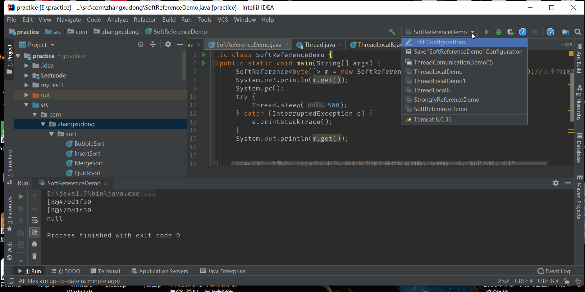 上面的代码首先我们在堆内存中申请了一个大小为10M的byte数组,之后通过软引用的get方法去得到这个数组在堆中的地址,从第一行的输出结果来看,我们是正确的拿到了这个地址的;之后主动调用gc线程去进行垃圾回收,让线程睡500ms后,我们继续通过软引用的get方法去拿这个数值的地址,通过第二行的输出结果得知,我们依然拿到了正确的地址。由此可知,虽然我们在上面通过gc调用了垃圾回收线程进行垃圾处理,但gc线程并没有回收这个byte数组对象,这是因为我们在运行程序的时候给其设置的最大堆内存为25M,而我们通过new byte[1024 * 1024 * 10]只是在堆中创建了大小为10M的对象,10M < 25M,堆内存目前还够用,所以gc不会去处理由“软引用”指向的这个数组对象。之后我们继续通过new byte[1024 * 1024 * 15]继续向堆内存中申请了大小为15M的空间来存放byte数组对象,这个时候因为我们初始设置的堆大小为25M,所以在jvm在申请第二次大小为15M的堆空间时,发现队中剩余的空间不够了(有的同学可能会问10M+15M=25M不是刚刚好吗?其实内存中除了我们刚开始申请的那10M,还会有一些其他的东西占用了很少的一部分空间,所以整体加起来10M+15M+其他是大于25M的,如果觉得不行,你可以在开始时设置堆得大小为-Xmx20M),这个时候gc线程就会回收由软引用m执行指向得那10M的空间。所以我们在程序最后通过软引用m的get()方法去拿的时候就已经拿不到了,因为它已经被回收掉了,所以输出结果为null。
