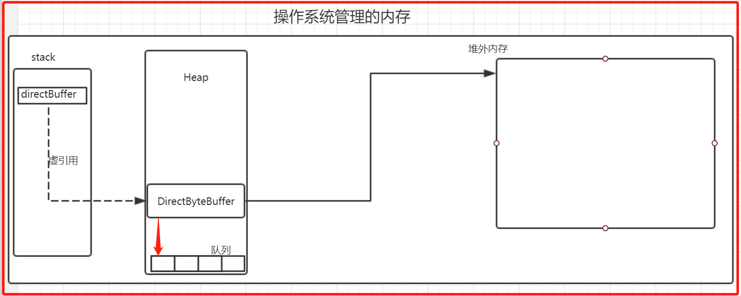 设想这样一个场景,在早期,当我的Java程序需要从网络上获取数据的时候,首先是由操作系统将相应的数据从网络上获取然后放到堆外内存,之后java再把这些数据从堆外内存拷贝到自己JVM管理的内存,这样就是出现了两次拷贝,效率比较低下。因此java就提供了一个可以直接管理堆外内存的DirectByteBuffer类,DirectByteBuffer指向的就是堆外内存,我们可以使用它进行堆外内存的分配/使用/回收。DirectByteBuffer这个类的对象本身是存储在JVM管理的堆内存中的,而由DirectByteBuffer指向的堆外内存是JVM管理不了的。所以当出现DirectByteBuffer对象本身被垃圾收集器回收掉的时候,它所指向的堆外内存就与它失去了关联,这样它指向的那块堆外内存就永远的停留在了哪里,不会被回收掉,这就造成了内存泄漏。所以为了避免由DirectByteBuffer引起的内存泄漏,jdk的设计者们就把指向“DirectByteBuffer对象”的引用(注意这里是指向DirectByteBuffer对象本身的引用,而不是DirectByteBuffer指向的堆外内存引用)设计为虚引用,这样,当JVM堆内存中的DirectByteBuffer对象被垃圾回收器干掉的时候,它就会向队列中存放相关的信息,这些信息就包含DirectByteBuffer指向堆外内存的地址,这个时候gc线程就会根据这个信息释放掉DirectByteBuffer所指向的堆外内存(注意gc线程是C++写的,它本身是可以去释放堆外内存的),从而避免了内存泄漏。