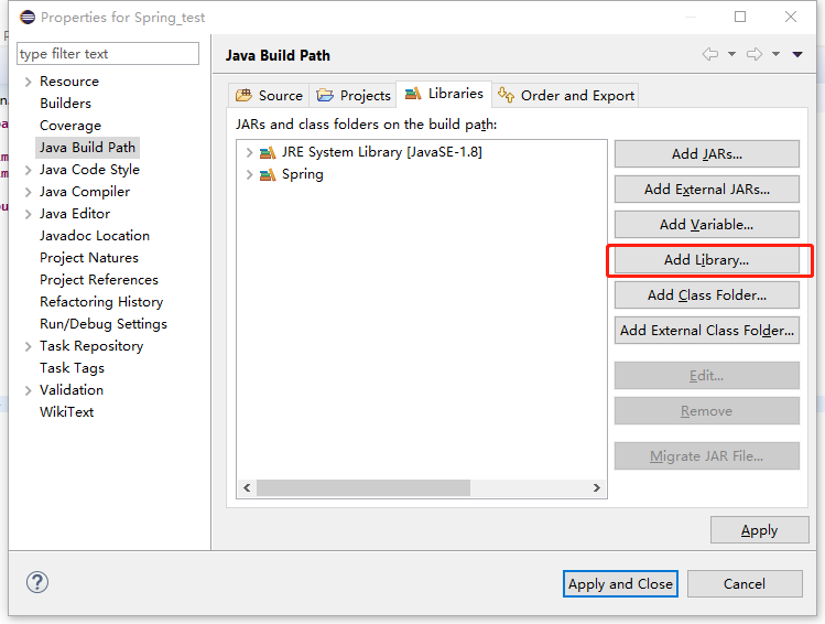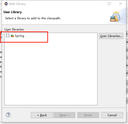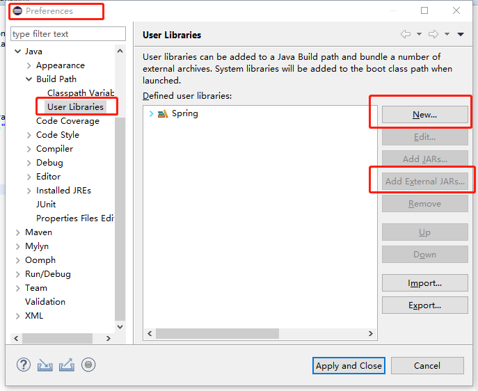 3. 在eclipse中windows->perference->user lbraryies,new新建Spring,然后再用AddExternal Jar将spring-4.3.1的libs目录下的jar包全部引入到Spring。