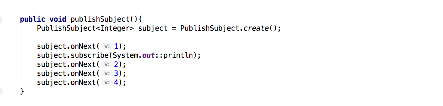 PublishSubject的操作是最直截了当的,当一个值被推到 PublishSubject中,这个 subject 就会把数据给到每个 subscriber,1 没有输出是因为在他 push 的时候没有 subscribed