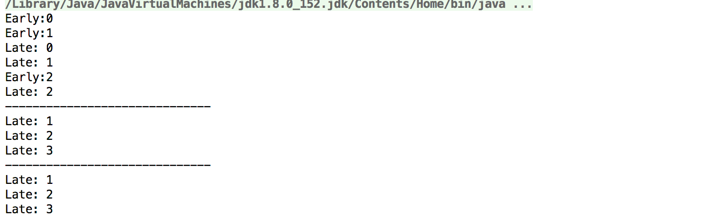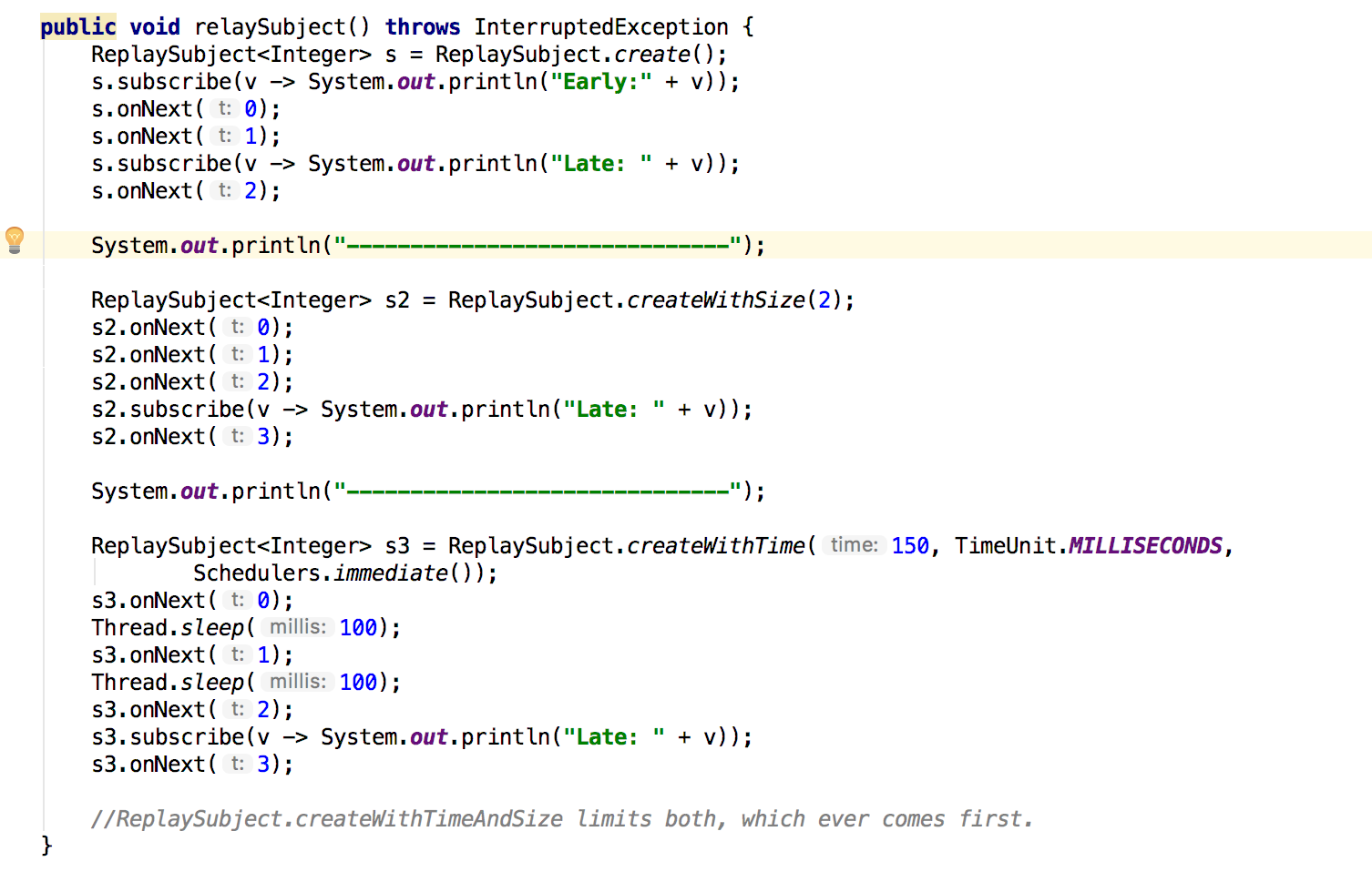 ReplaySubject有一个缓存所有推向它数据的特性,当一个新的subscription建立,时间流将会重新开始推向subscriber,之后的就像 PublishSubject 实现一样。在看ReplaySubject的第二个例子可以知道,缓存所有的不是一个好主意,这样 observable 序列会执行很长时间,我们可以使用 ReplaySubject.createWithSize 限制缓存的大小。在第三个例子中可以看出使用 ReplaySubject.createWithTime 限制缓存的时间。
