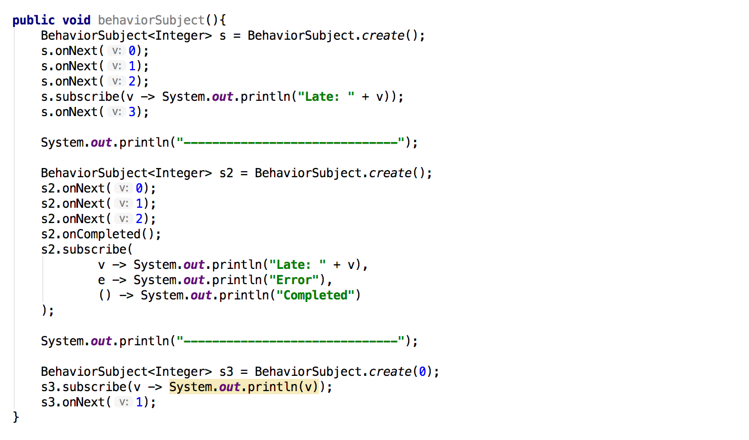 BehaviorSubject仅仅保留最后一个值,类似于 ReplaySubject 设置缓存一个,当创建的时候,subscription会执行。第二个例子,执行 onCompleted()方法,这是最后一个事件。第三个例子展示可以设置初始值。