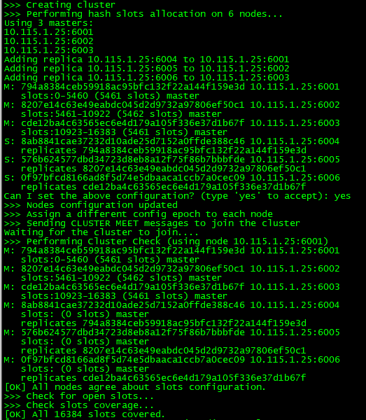 /usr/dev/redis-3.2.1/src/redis-trib.rb create --replicas 1 10.115.1.25:6001 10.115.1.25:6002 10.115.1.25:6003 10.115.1.25:6004 10.115.1.25:6005 10.115.1.25:6006