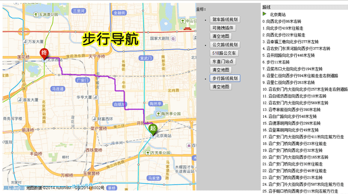 } //输出步行路线指示 route_text = "<table cellspacing=\"5 px\" ><tr><td style=\"background:#e1e1e1;\">路线</td></tr><tr><td><img src=\"http://code.mapabc.com/images/start.gif\" /> 北京南站</td></tr>" + route_text + "<tr><td><img src=\"http://code.mapabc.com/images/end.gif\" /> 北京站</td></tr></table>";
