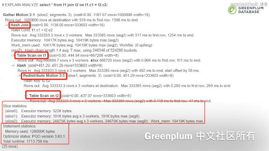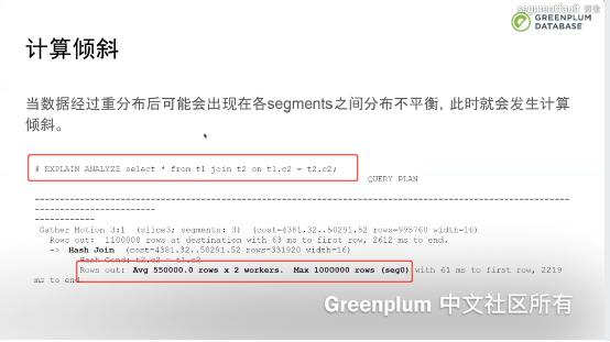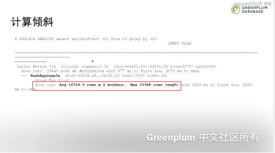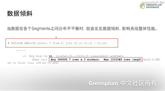 使用EXPLAIN ANALYZE出现以下信息说明执行了3个workers,每个workers平均执行了366666.7行的数据,在seg0上最大执行了1033348行数据,说明大部分的数据都在seg0上,有数据倾斜的现象。