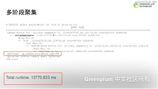 以下是把gp_enable_multiphase_agg参数关闭的情况下,耗时13770.833ms,数据库默认的这个参数是打开的。