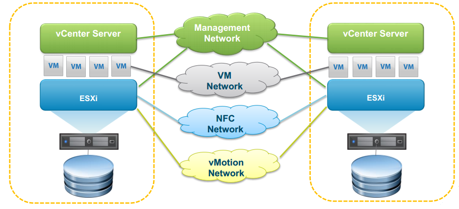 上图中,左侧ESXi主机上的虚拟机可以通过vMotion Network向右侧ESXi主机迁移。虚拟机主要由(1)由虚拟CPU、虚拟内存、虚拟网卡等虚拟部件组成的虚拟计算部分和(2)由虚拟磁盘等虚拟存储,两大部分组成。成功搬家之后,该虚拟机的第(1)部分和第(2)部分都迁移到另一台物理机和另一处存储设备。