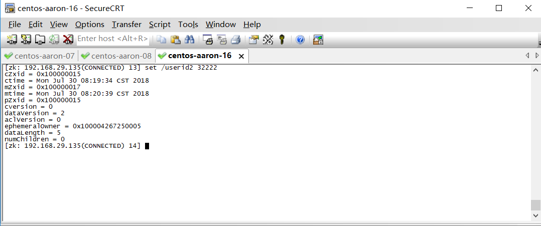 5)、set命令,用于设置节点的数据,如:set /userid2 32222