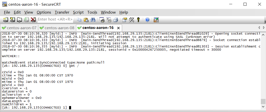 1)、运行 zkCli.sh –server <ip>进入命令行工具:./zkCli.sh -server 192.168.29.135