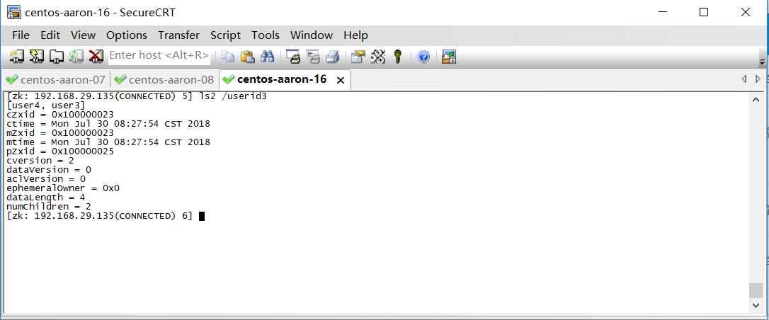 ephemeralOwner:如果该节点为临时节点,ephemeralOwner值表示与该节点绑定的session id. 如果该节点不是临时节点,ephemeralOwner值为0