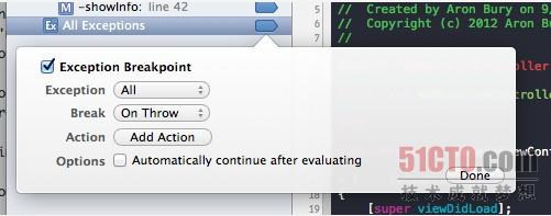 通过设定异常断点,我们就能够精确定位引发异常情况的代码行。要做到这一点,首先得打开异常断点选项卡(快捷键为command+6)。在窗口底部 会出现一个“+”按钮,点选该按钮即可添加“异常断点”。现在,一旦Xcode在运行中遭遇异常,即会在引发问题的代码处中断。