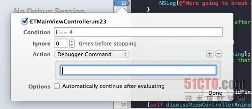 条件断点,顾名思义是指只会在特定条件下触发的断点。设想一下,当我们只希望断点在某对象在特定状态或者“第n次”循环更替时发生,条件断点就成为 大家的不二选择。在Xcode编辑器中点击“gutter”来在代码中添加一个断点 ,右击该断点并选择“edit breakpoint(编辑断点)”为其设置特殊条件。