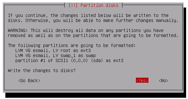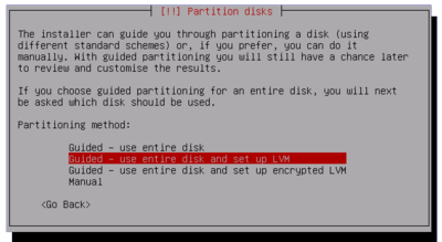 2)使用整个磁盘并使用 LVM (use entrie disk and use LVM) - 这个方案会删除硬盘上所有分割区,然后使用 LVM 分割硬盘。如果您硬盘上有其他您想保留的操作系统,请不要选择此项。