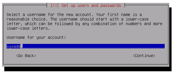 接着输入使用者名称 (name use to log in),即是登入时使用的名称,只可以用英文字母、数目字、减数 (-) 及底线符 (_) 组成,中间不可以有空格和头一个字符必需为英文字母。留意 Unix/Linux 的用户名称是分大小写的,即 jrandom、JRANDOM 和 JRandom 为三个不同的用户。为避免混淆,建议大家最好用全小写字母作为使用者名称。