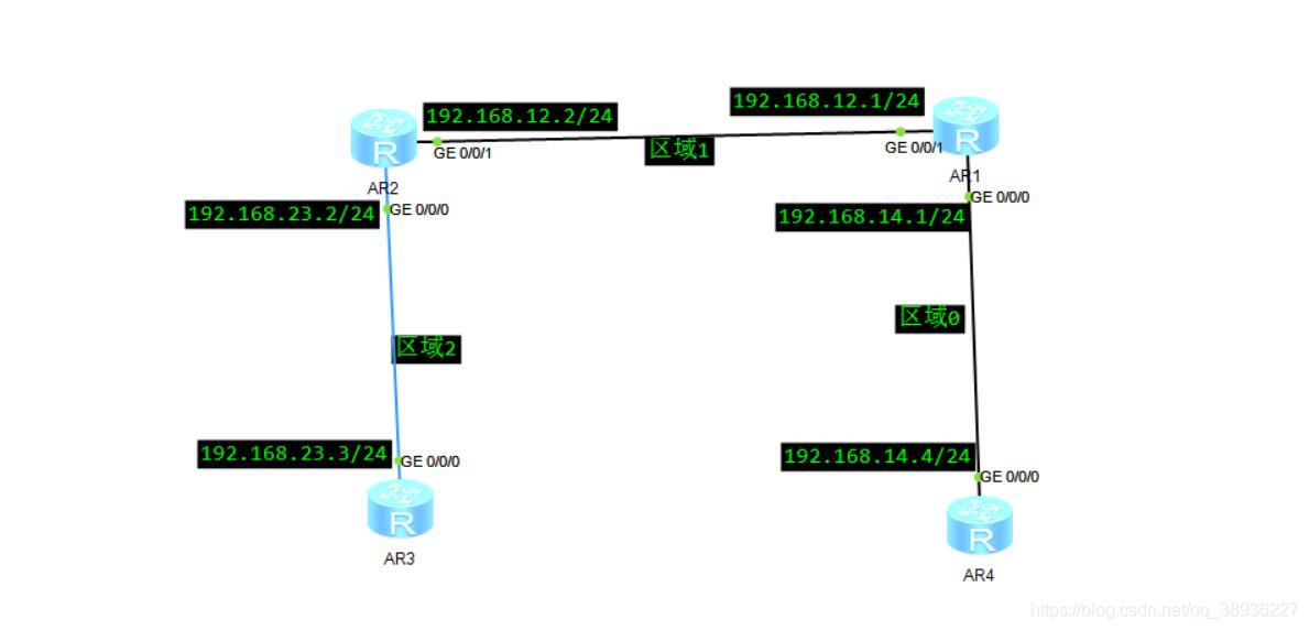 [AR-2-ospf-1-area-0.0.0.1]network 192.168.12.0 0.0.0.255 //配置IP地址和反掩码