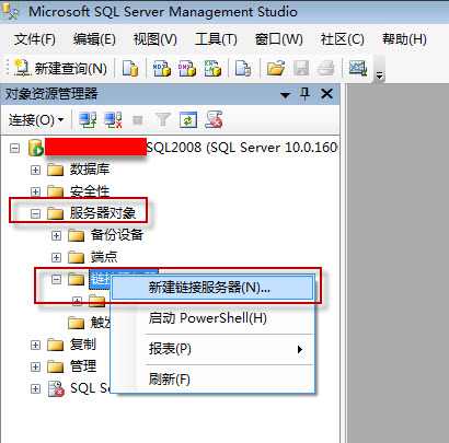 2.在sql server2008的Management Stadio 中——链接服务器——新建链接服务器