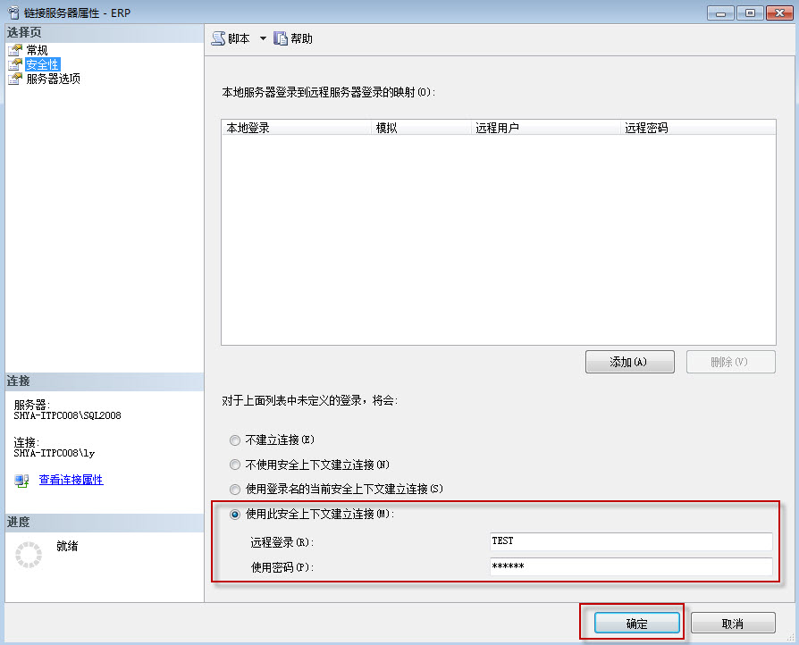 【链接服务器名字】:自己取一个,我这里写ERP