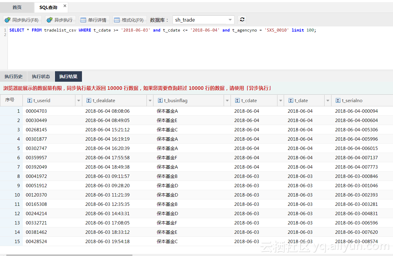 1.查询交易机构SXS_0010,在0603至0604的100条交易记录