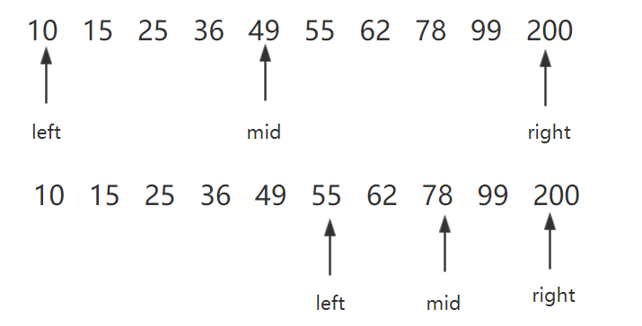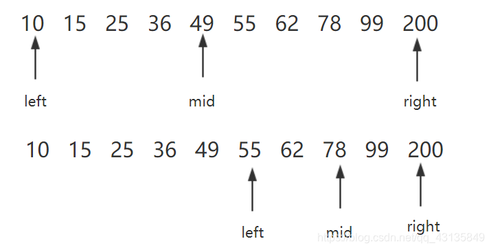 下面给出一张查找的例图,以数组10,15,25,36,49,55,62,78,99,200为例,查找78