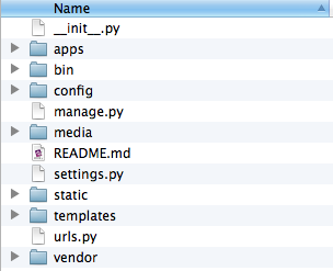apps目录用于存放一些自定义的Django apps, vendor目录用于存放一些你不想通过pip 或者easy_install安装的apps。bin目录存放所有bash脚本,用于自动化部署。我在这里边有一些脚本用于部署到stage produection 服务器, 清理目录, 压缩资料(asserts), 备份数据库, 启动/停止 celery(本地)等等。config目录存放所有的包括数据库、web服务、munin、celery、supervisor等的配置文件。 media目录存放所有的静态文件,包括javascript,css,images,fonts等。 templates 存放所有是你的网站美观的html模板。最后, static目录存放所有压缩过的用于生产环境的文件(asserts)。我甚至在github上面建了一个模板,去试试吧!