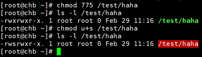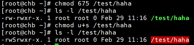 查看文件属性时发现所有者的权限由rwx变成了rws,其中x改变成s就意味着该文件被赋予了SUID权限。另外如果原先权限位上没有x执行权限,那么被赋予特殊权限后将变成大写的S。