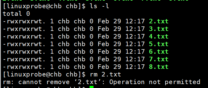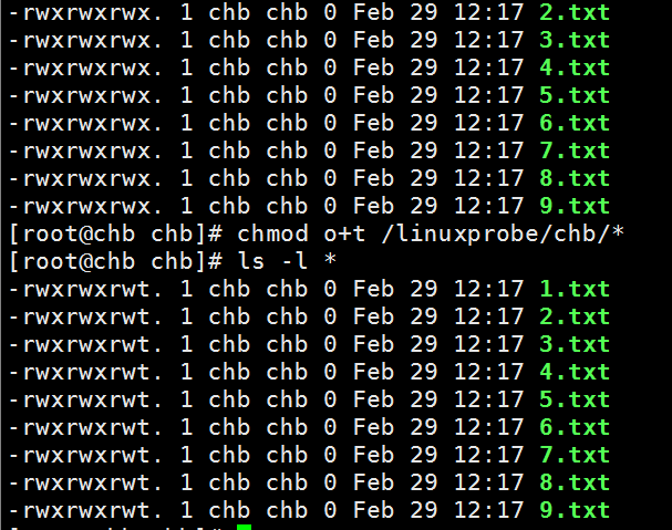 目录被设置SBIT特殊权限位后,文件的其他人权限部分的x执行权限就会被替换成t或者T,原本有x执行权限则会写成t,原本没有x执行权限则会被写成T。