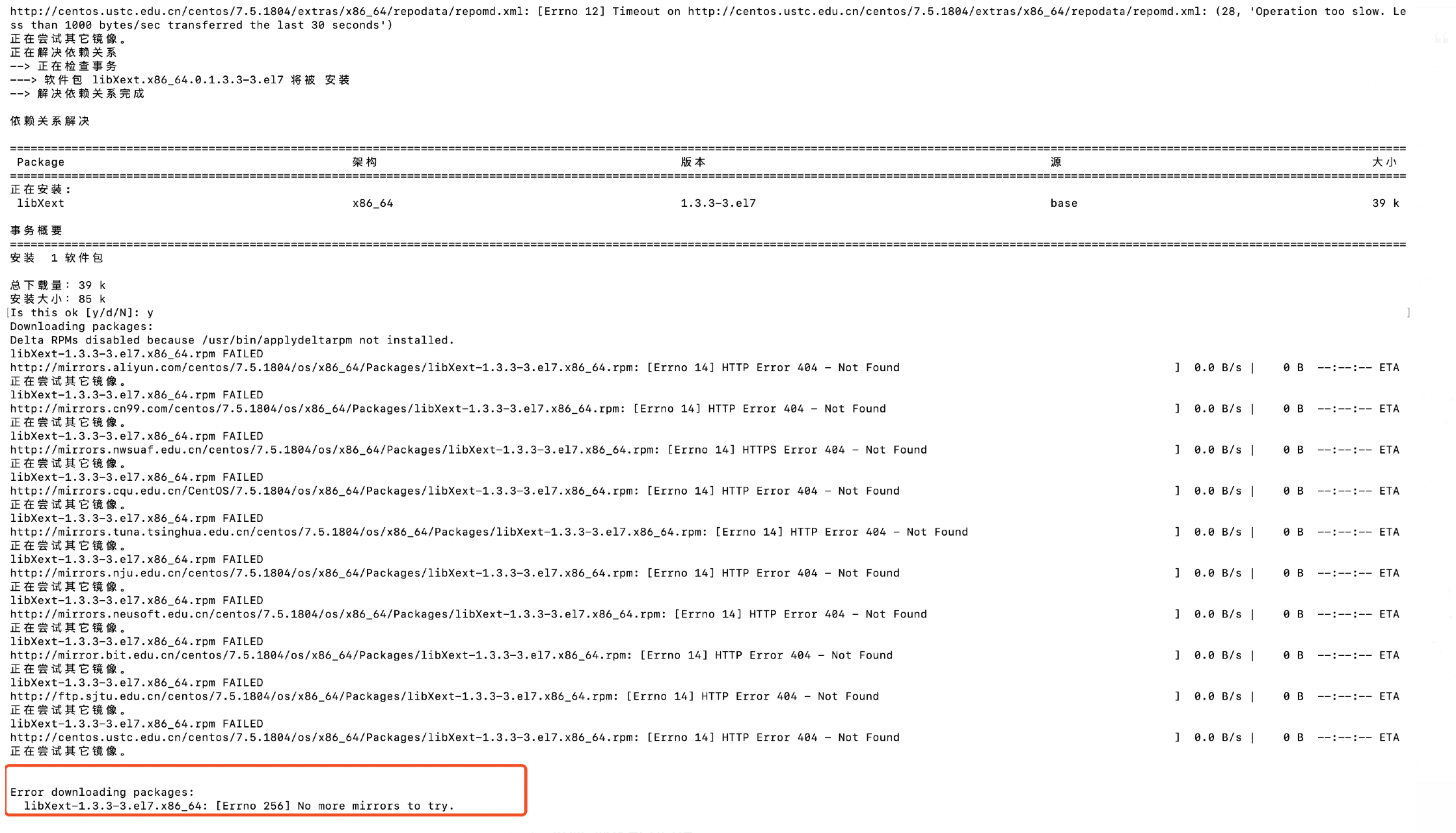 使用 yum 安装软件时,出现 [Errno 256] No more mirrors to try.