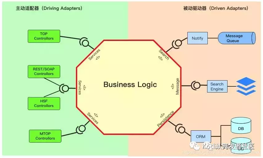 纵观上面介绍的所有应用架构,我们可以发现一个共同点,就是“核心业务逻辑和技术细节分离”。![]()