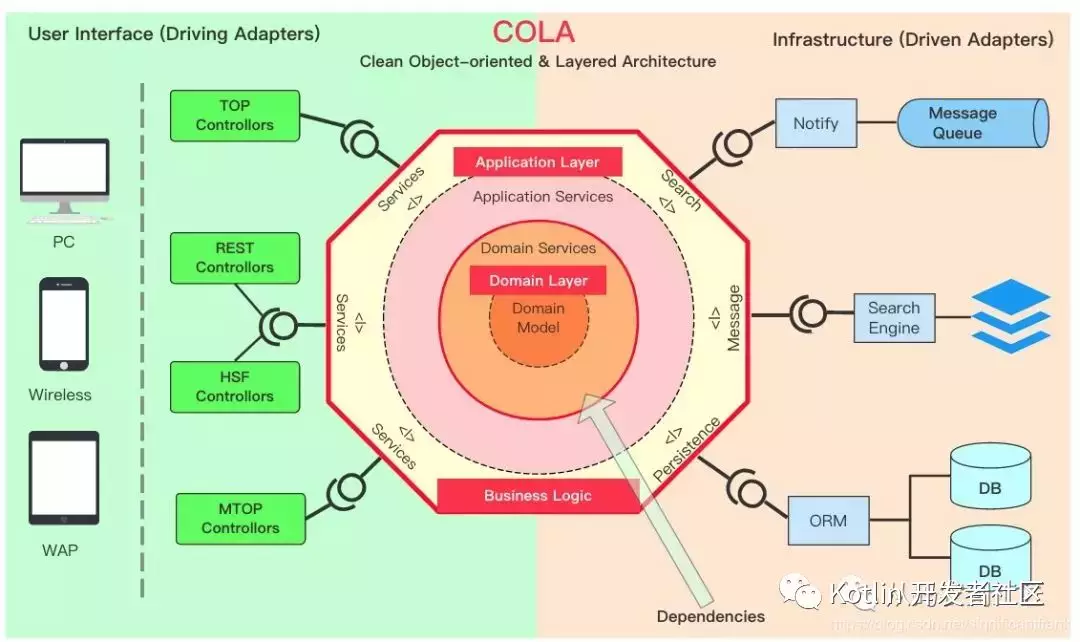 在架构思想上,COLA主张像六边形架构那样,使用端口-适配器去解耦技术细节;主张像洋葱圈架构那样,以领域为核心,并通过依赖倒置反转领域层的依赖方向。最终形成如下图所示的组件关系。